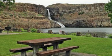 June 3, 2018. Head south out of Coulee City on Pinto Ridge Road. When you get to Dry Coulee Road (on the right), go a few feet farther and look for a dirt road to your left. The sign for Summer Falls is way, way back from Pinto Ridge Road, so unless have your head cranked to the left to spot the sign and the track, you’ll drive right by it. The falls themselves are a surprise in that rocky desert terrain, cascading over the top of a basalt cliff into a lake. There are restrooms, picnic tables, shade trees, and moist, cool, green lawn. It’s a nice place to stop for a midday snack and a dip in the lake. Warning: there is a memorial at the park for three teenagers who were caught in the falls’ undertow, so keep your distance from the cascade.